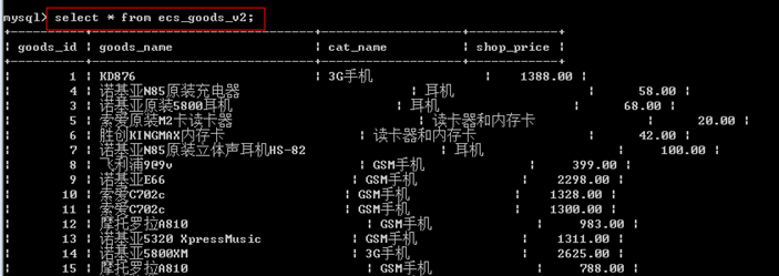 select goods_id,goods_name,b.cat_name,shop_price from ecs_goods a left join ecs_category b on a.cat_id=b.cat_id;