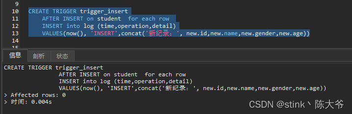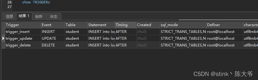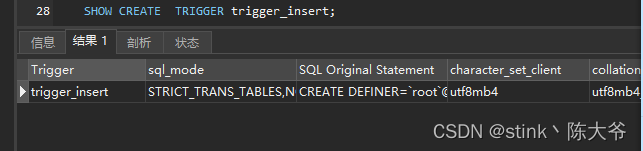 -执行命令:SHOW CREATE TRIGGER trigger_insert;