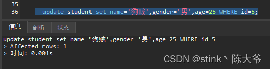 -更新第5条记录,执行语句: update student set name='狗贼',gender='男',age=25 WHERE id=5;