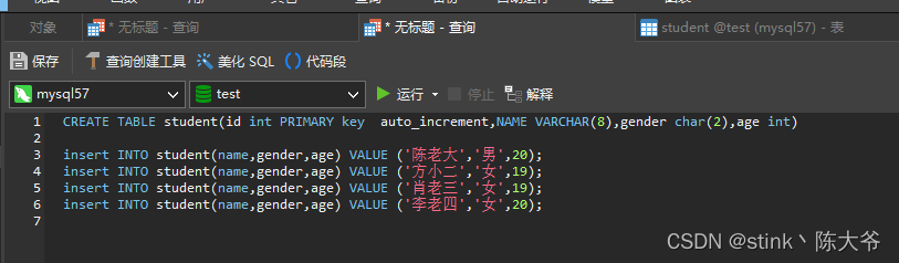 - 创建student表,包含id, name, gender, age. 并插入5条记录