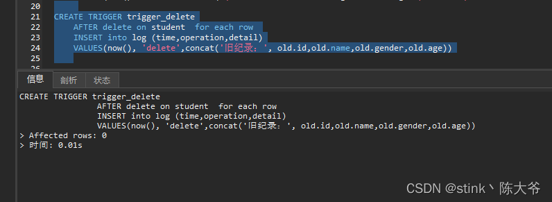 -执行命令:SHOW CREATE TRIGGER trigger_delete;