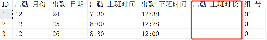 插入上述两列 "出勤"表,出勤_上班时长不插数据,插入完成后计算它。出勤_上班时长 = 出勤_下班时间 - 出勤_上班时间