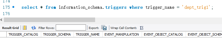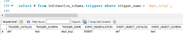 结果显示了触发器dept_trig1的详细信息。这种方式可以查询指定的触发器,使用起来更加方便、灵活。