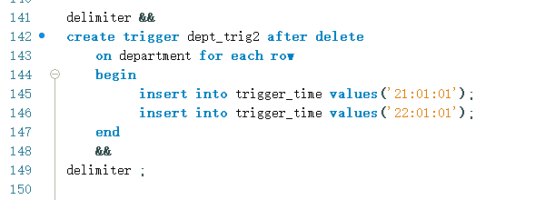!!!一般情况下,MySQL默认是以“;”作为结束执行语句。在创建触发器过程中需要用到“;”。为了解决这个问题,可以用DELIMITER语句。如“DELIMITER&&”,可以将结束符号变成“&&”。当触发器创建完成后,可以用命令“DELIMITER;”来将结束符号变成“;”。