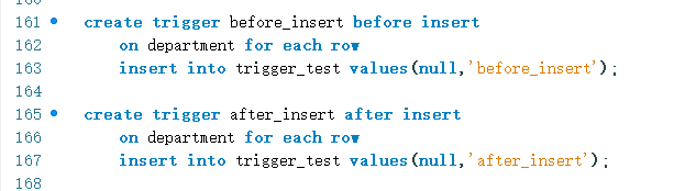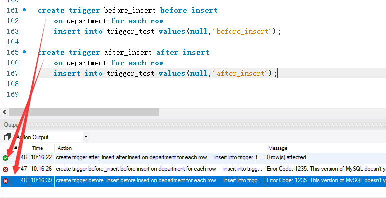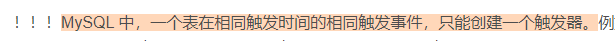 !!!MySQL 中,一个表在相同触发时间的相同触发事件,只能创建一个触发器。例如,在 department表中,触发事件INSERT,触发时间为AFTER 的触发器只能有一个。但是,可以定义触发事件为BEFORE的触发器。如果该表中执行INSERT语句,那么这个触发器就会自动执行。