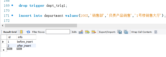 查询结果显示, before_insert和 after_insert触发器被激活。先激活before_insert触发器,然后再激活after_insert触发器。