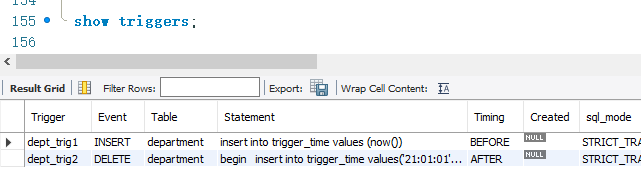 结果显示了所有触发器的基本信息。因为数据库中暂时只有两个触发器,所以只显示了这两个触发器的基本信息。