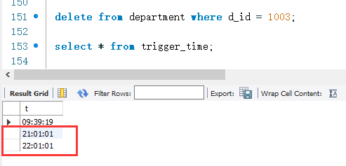 执行结果显示,在向department表中执行DELETE操作时,trigger_time中插入了两条记录。从这个例子可以看出,触发器可以同时执行多条执行语句。