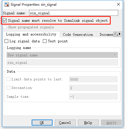 先双击信号线,添加信号标签(信号名称),再打开属性对话框,勾选“Signal name must resolve to signal object”。