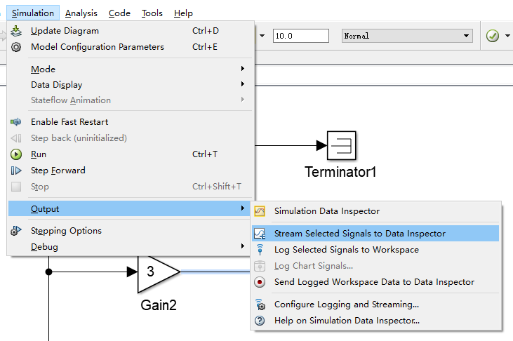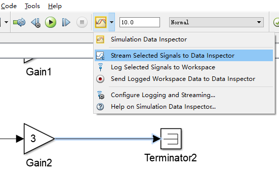 或者在菜单中:Simulation => Output => Stream Selected Signals to Data Inspector: