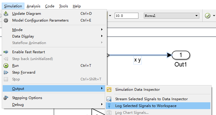 也可以使用菜单:Simulation => Output => Log Selected Signals to Workspace