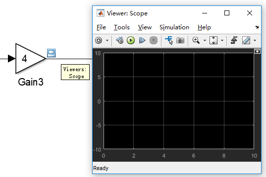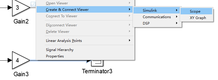 选中信号线,点击右键,选择菜单:Create & Connect Viewer => Simulink => Scope