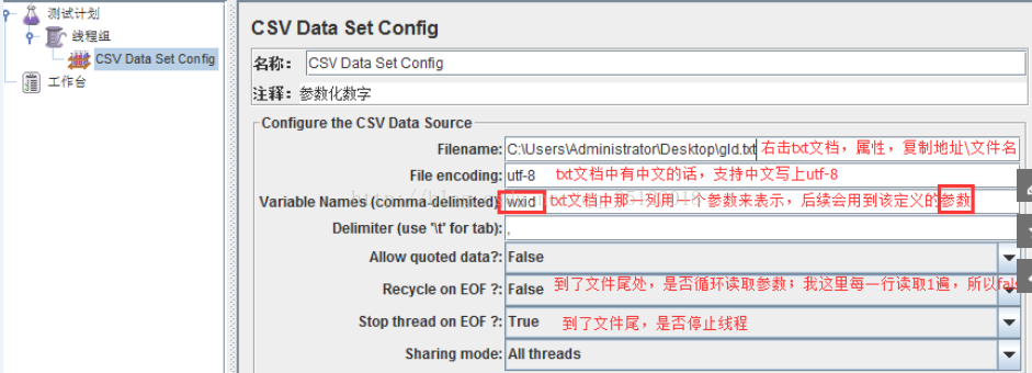 右击“线程组”-添加-配置元件-CSV Data Set Config,并配置