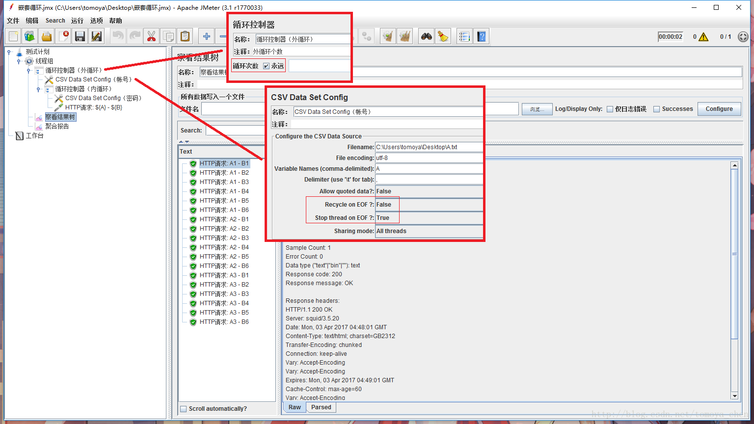 这里还可以优化一下。在外循环中的CSV Data Set Config里关闭循环,同时设定外循环控制器的循环次数为永远。