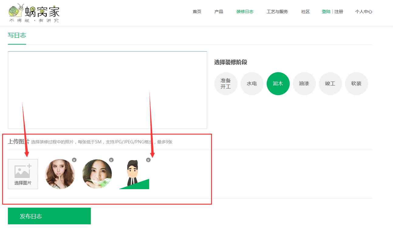 <h2><b>上传图片</b>选择装修过程中的照片,每张低于5M,支持JPG/JPEG/PNG格式,最多9张</h2>