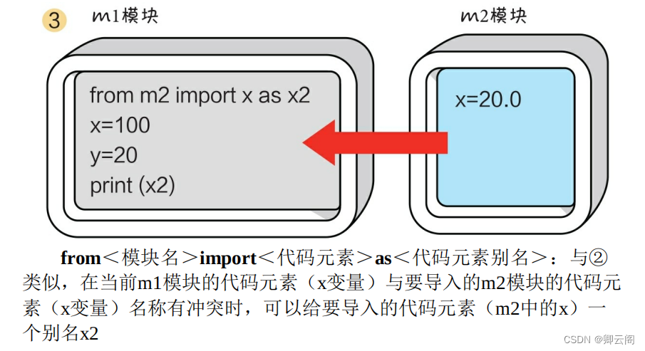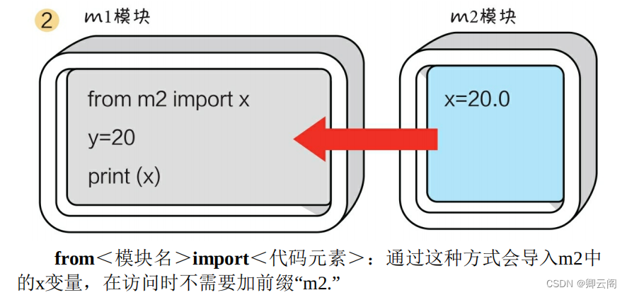 import+模块名,这种方式会导入m2模块的所有元素在访问时, 需要加上前缀"m2."。