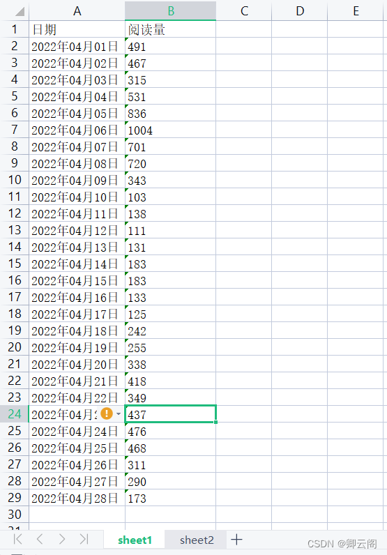 # 导入模块 import xlrd # 打开文件方式1: work_book = xlrd.open_workbook(r'C:UsersqingyunDesktop全部文章分析.xlsx') # 获取工作簿中sheet表数量 print(work_book.nsheets) #结果 2获取工作簿对象属性:print("----------获取工作簿对象属性----------") print("1.-----获取工作簿中sheet表数量-----") print("获取工作簿中sheet表数量{0}".format(work_book.nsheets)) print("2.-----获得工作表中所有的sheet表对象-----") sheets=work_book.sheets() print("获得工作表中所有的sheet表对象{0}".format(sheets)) print("3.-----获取工作簿所有sheet表对象名称-----") sheets_name = work_book.sheet_names() print("获取工作簿所有sheet表对象名称-{0}".format(sheets_name)) #结果 ----------获取工作簿对象属性---------- 1.-----获取工作簿中sheet表数量----- 获取工作簿中sheet表数量2 2.-----获得工作表中所有的sheet表对象----- 获得工作表中所有的sheet表对象[<xlrd.sheet.Sheet object at 0x0000010F7585ACD0>, <xlrd.sheet.Sheet object at 0x0000010F7585AD60>] 3.-----获取工作簿所有sheet表对象名称----- 获取工作簿所有sheet表对象名称-['sheet1', 'sheet2']按索引、名称获取sheet表对象