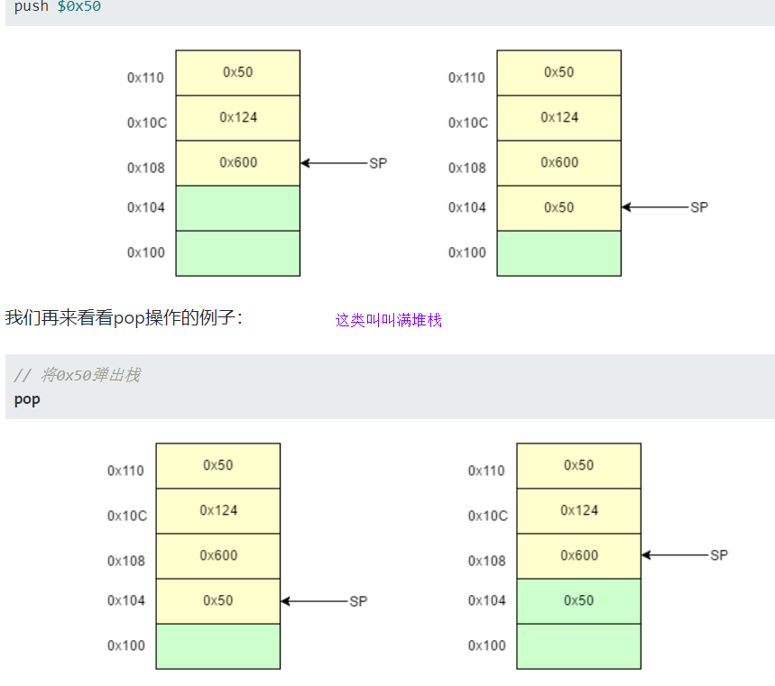 另外一种sp指向下一个待压入数据的空位置(SP指向的位置没有有效数据),称为空堆栈,这种堆栈的操作先写入数据再调整sp