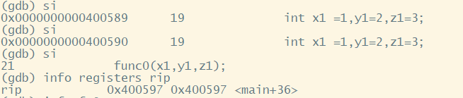 从下图可知进入main函数后rip指向了main局部变量开始赋值的位置(start为c语言级别调试,无法控制main在此之前的汇编)