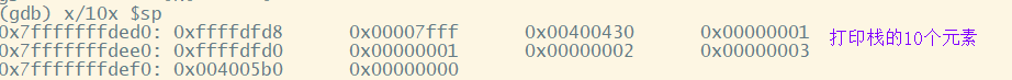 查看当前程序栈的内容: x/10x $sp-->打印stack的前10个元素
