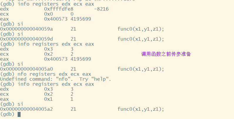 查看当前寄存器的值:info registers(不包括浮点寄存器) info all-registers(包括浮点寄存器)