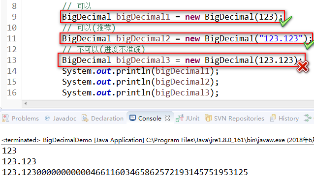 BigDecimal bigDecimal = new BigDecimal(xxx);其中,xxx可以是整型数据,也可以是数字内容的字符串数据,但不可以是浮点型数据,如: