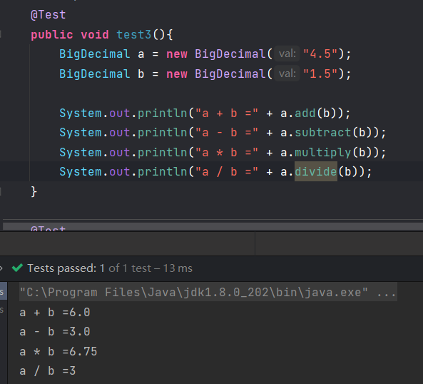 这里有一点需要注意的是除法运算divide. BigDecimal除法可能出现不能整除的情况,比如 4.5/1.3,这时会报错java.lang.ArithmeticException: Non-terminating decimal expansion; no exact representable decimal result.
