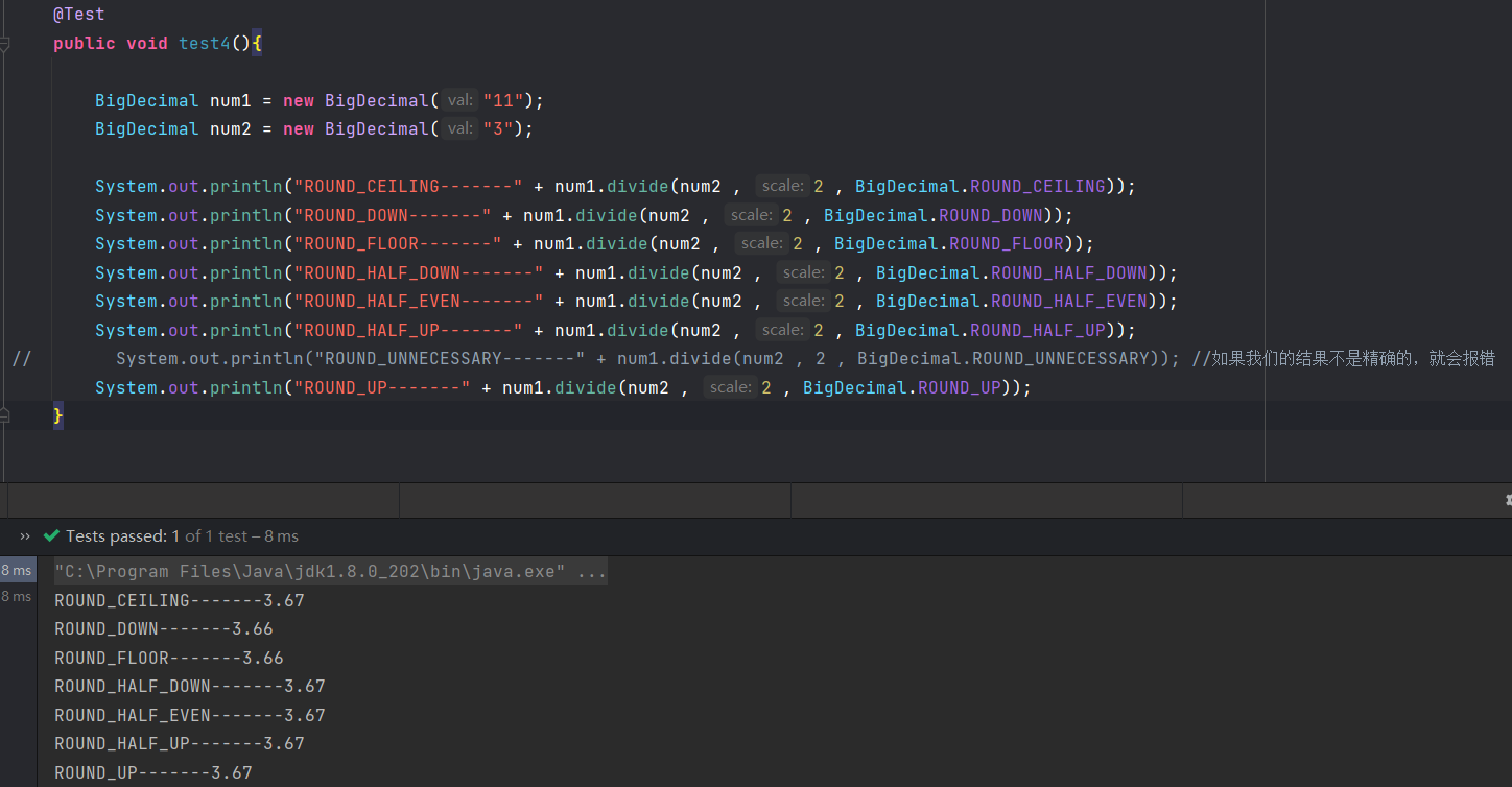 其中RoundingMode.UNNECESSARY如果使用的话,设置的小数位数必须和原来的一样,否则会报错(因为是精确)