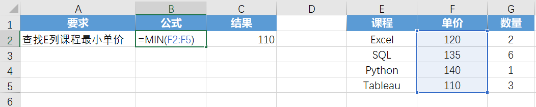 案例: 查找E列课程最小单价