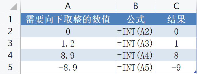 INT函数用于返回需要进行向下舍入取整的数值,向下舍入负数会朝着远离0的方向将数字舍入