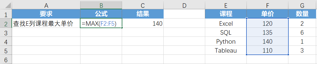 案例: 查找E列课程最大单价