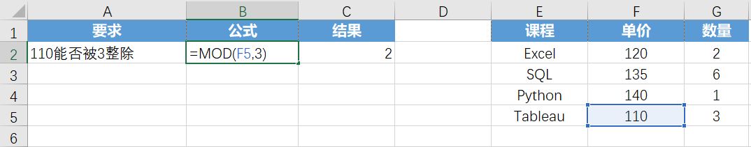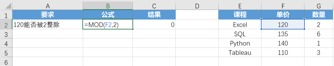 MOD函数用于返回两数相除的余数 (能被整除返回0,不能被整除返回余数)