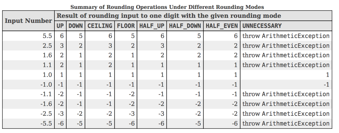 第二个参数RoundingMode决定的是如何对小数进行精确,这是重点讲解的部分。roundIngMode是定义好的枚举类,他有以下几个值ROUND_UP,ROUND_DOWN,ROUND_CEILING,ROUND_FLOOR,ROUND_HALF_UP,ROUND_HALF_DOWN,ROUND_HALF_EVEN。这些枚举类的效果如下图所示(图片来源Java文档)