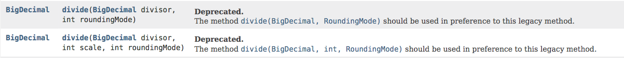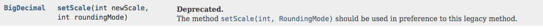 同样的,关于RoundingMode roundingMode这个参数,Java仍然提供int roundingMode的形式,不过是被弃用的,一定要使用RoundingMode枚举类。