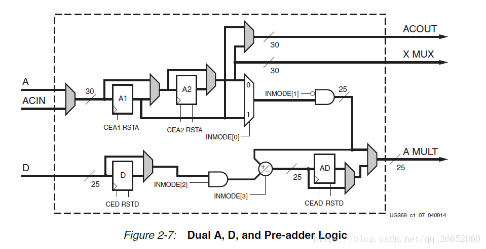 A和B输入端口以及ACIN和BCIN级联端口在其数据路径中可以具有0,1或2个流水线级。双A,D和预加法器端口逻辑如图2-7所示。