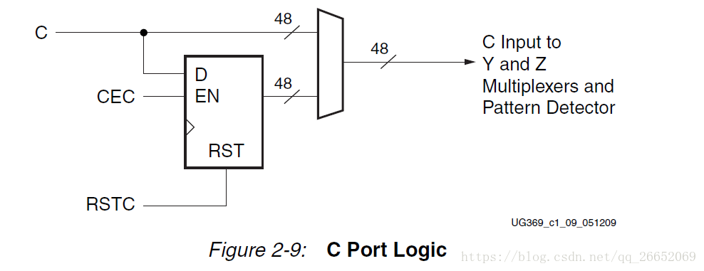 48位C端口用作多路复用器的通用输入即Y输入和Z输入,以执行加,减,三输入加/减和逻辑功能。 C输入还连接到模式检测器,用于舍入功能实现。 C端口逻辑如图2-9所示。 CREG属性选择C输入数据路径的流水线级数。