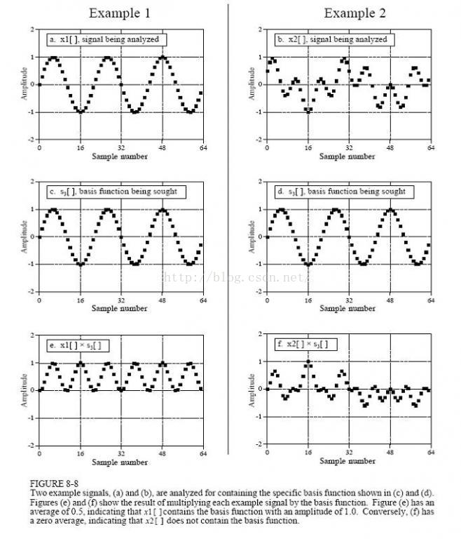利用第一种方法、信号的相关性(correlation)可以从噪声背景中检测出已知的信号,我们也可以利用这个方法检测信号波中是否含有某个频率的信号波:把一个待检测信号波乘以另一个信号波,得到一个新的信号波,再把这个新的信号波所有的点进行相加,从相加的结果就可以判断出这两个信号的相似程度。如下图: