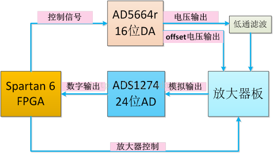 ◎offset 调节:控制放大板的输入接地,将放大器的放大倍数设置为1000倍,测试AD 的输出电压是否为0V,如果不是,则说明放大器内部有直流偏置,通过调节DA的offset输出电压,使得放大板在输入为0v时,输出也为0v。