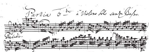 这通常被称为波形图。毫无疑问,它包含了关于这段声音的全部信息。但是同样毫无疑问的是,这些信息几乎没法从上面这个「函数」中直接看出来,事实上,它只不过是巴赫的小提琴无伴奏 Partita No.3 的序曲开头几个小节。下面是巴赫的手稿,从某种意义上说来,它也构成了对上面那段声音的一个「描述」: