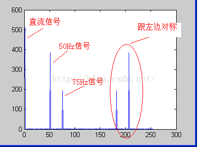 式中cos参数为弧度,所以-30度和90度要分别换算成弧度。我们以256Hz的采样率对这个信号进行采样,总共采样256点。按照我们上面的分析,Fn=(n-1)*Fs/N,我们可以知道,每两个点之间的间距就是1Hz,第n个点的频率就是n-1。我们的信号有3个频率:0Hz、50Hz、75Hz,应该分别在第1个点、第51个点、第76个点上出现峰值,其它各点应该接近0。实际情况如何呢?我们来看看FFT的结果的模值如图所示。