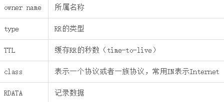DNS层级结构中,不管是节点还是叶子节点都是资源,对这些资源中的某一个的标识使用一定格式的多字段的一条记录来表示,这条记录就是资源记录RR。RR的标准记录在RFC 1034中。