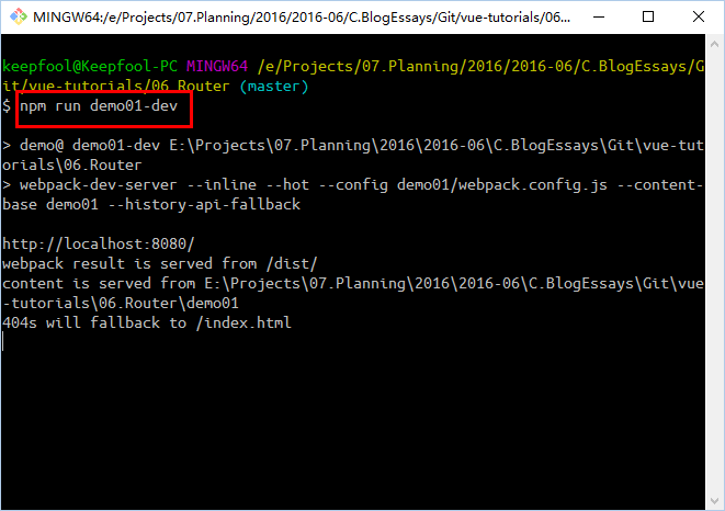 当你从GitHub上获取到最新的源代码后,如果想运行皇帝版,以demo01为例,在GitBash下执行以下命令:npm run demo01-dev