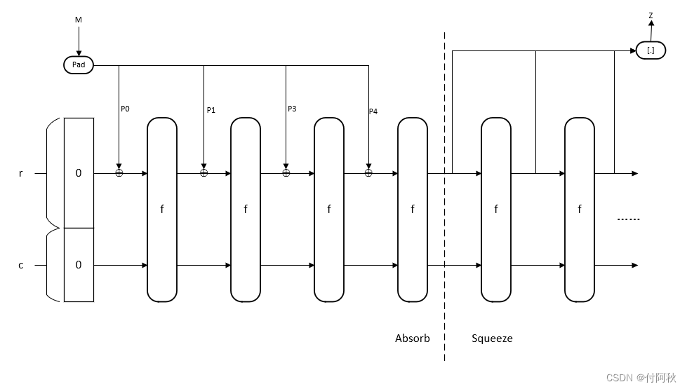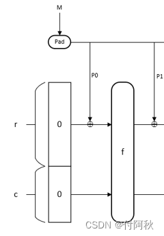 轮函数f稍后学习。对于次轮函数迭代,输入输出均分为两部分,即低r比特部分和长度c部分,r部分会与输入的明文分组P进行异或与上一轮输出的c部分拼接作为本次迭代的输入。