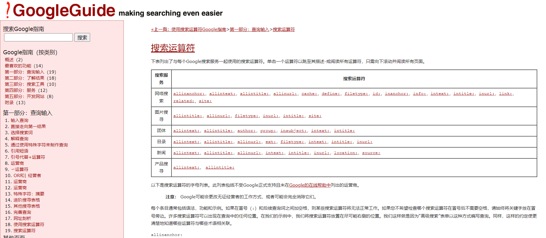 | 目录 | allintext:,allintitle:,allinurl:,ext:,filetype:,intext:,intitle:,inurl: |