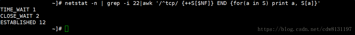 某服务器的sshd的监听端口是22,如何统计这台服务器的sshd服务各种状态(TIME_WAIT/CLOSE_WAIT/ESTABLISHED)的连接数,以便快速定位问题