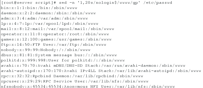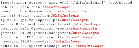 [root@server script]# grep -m10 '/sbin/nologin$' /etc/passwd ##在/etc/passwd的文件中匹配以/sbin/nologin为行尾的前10行内容