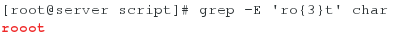 [root@server script]# grep -E 'ro{3}t' char ##r和t之间出现3个o