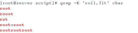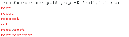 [root@server script]# grep -E 'ro{1,3}t' char ##r和t之间出现1~3个o