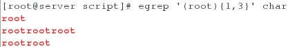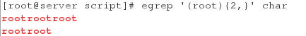 [root@server script]# egrep '(root){2,}' char ##匹配至少有两个连续"root"的行