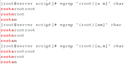 [root@server script]# egrep '(root)[am]' char ##匹配有字符"roota" "rootm"的行
